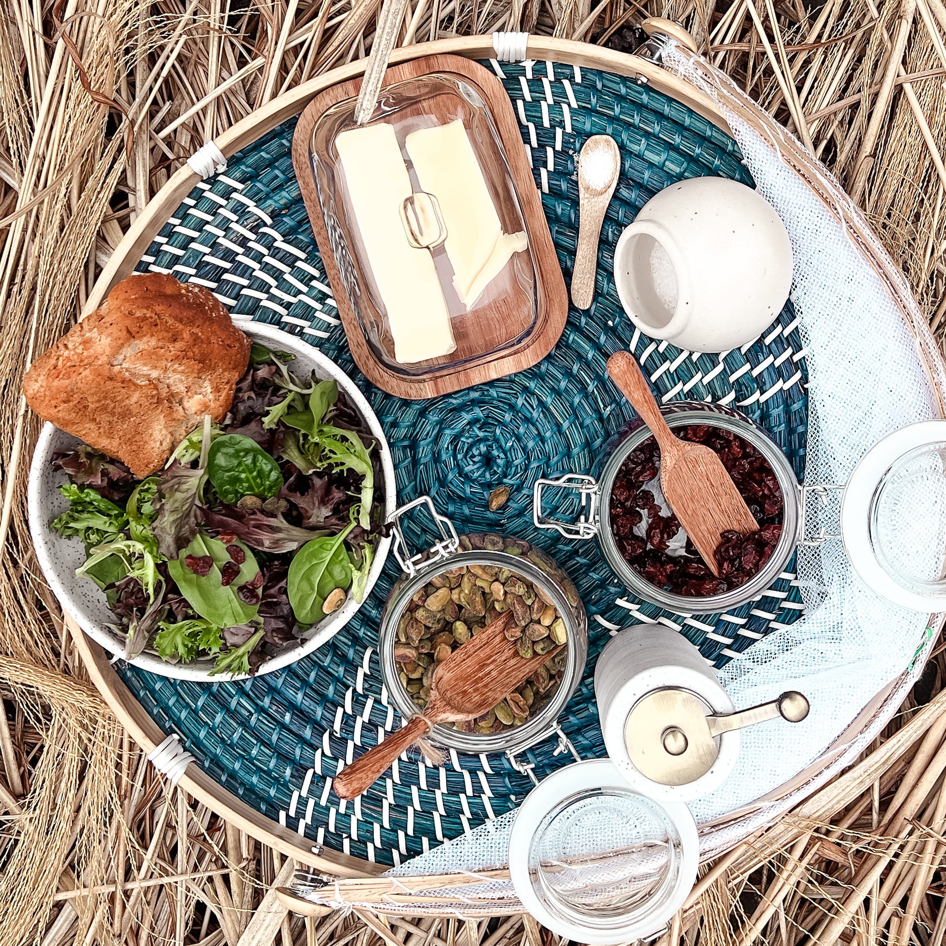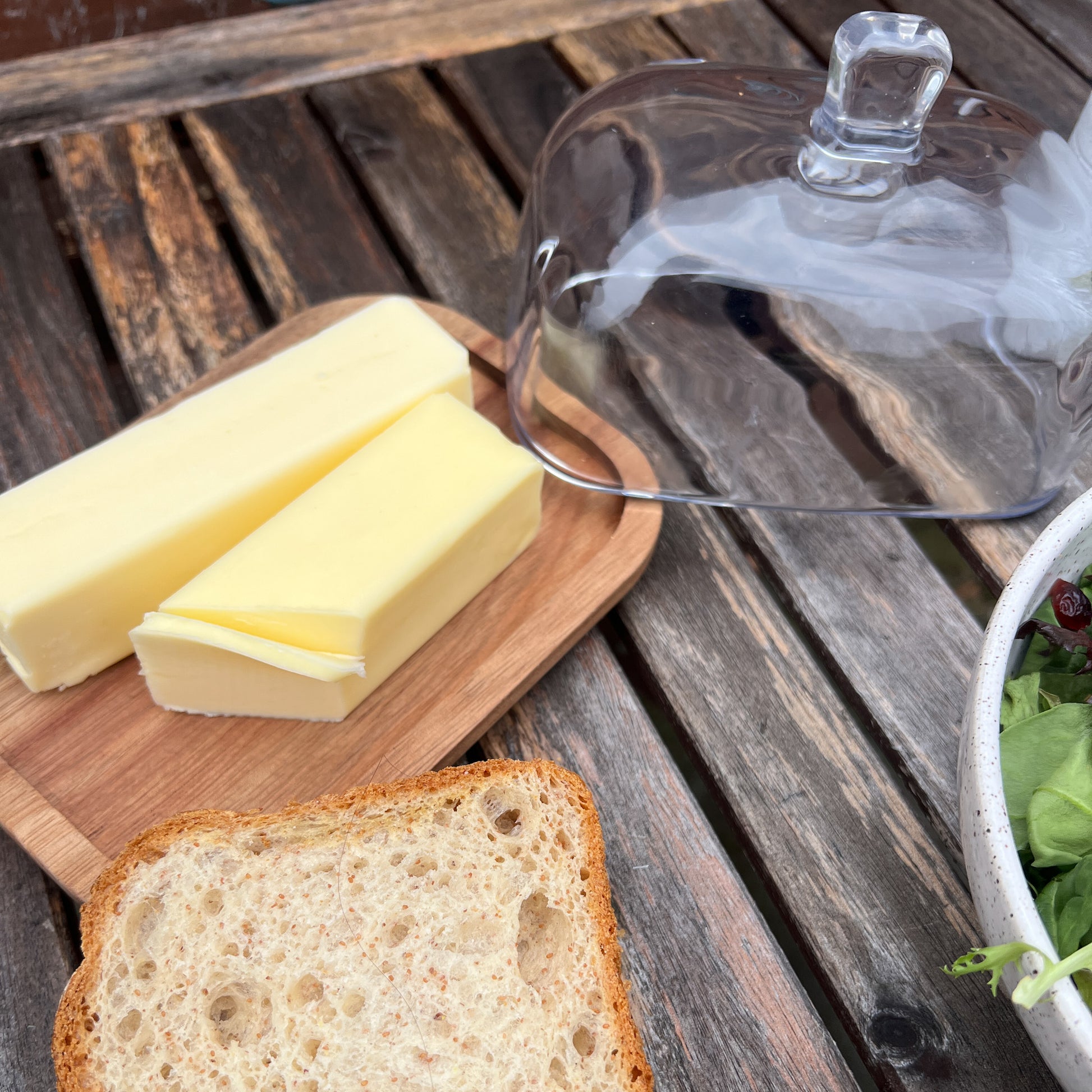 This doublewide glass cloche with coordinating acacia wood tray elegant & understated, usable for more than just butter.