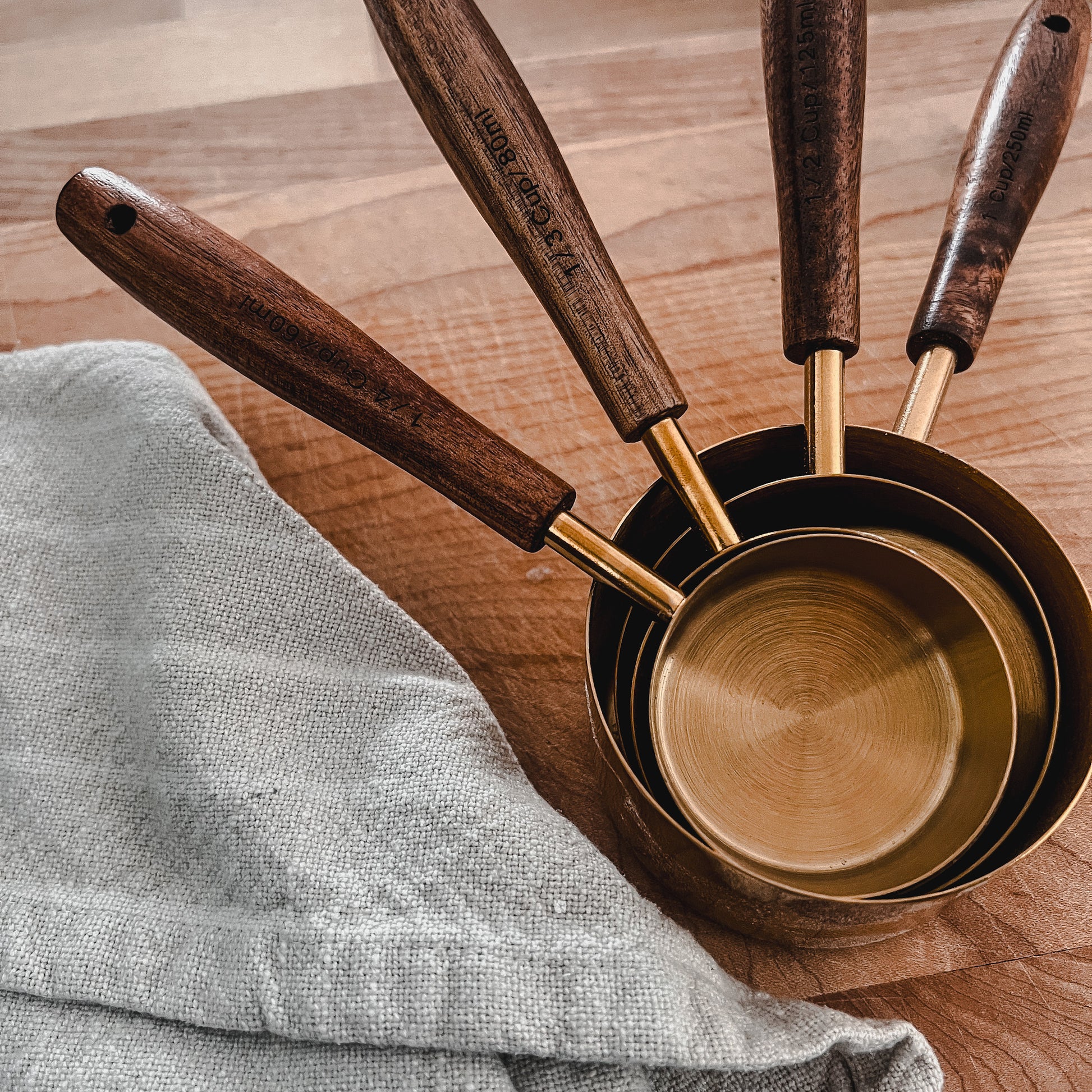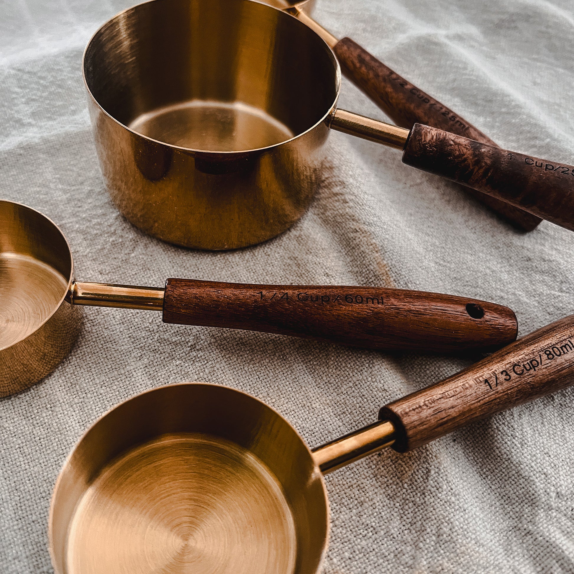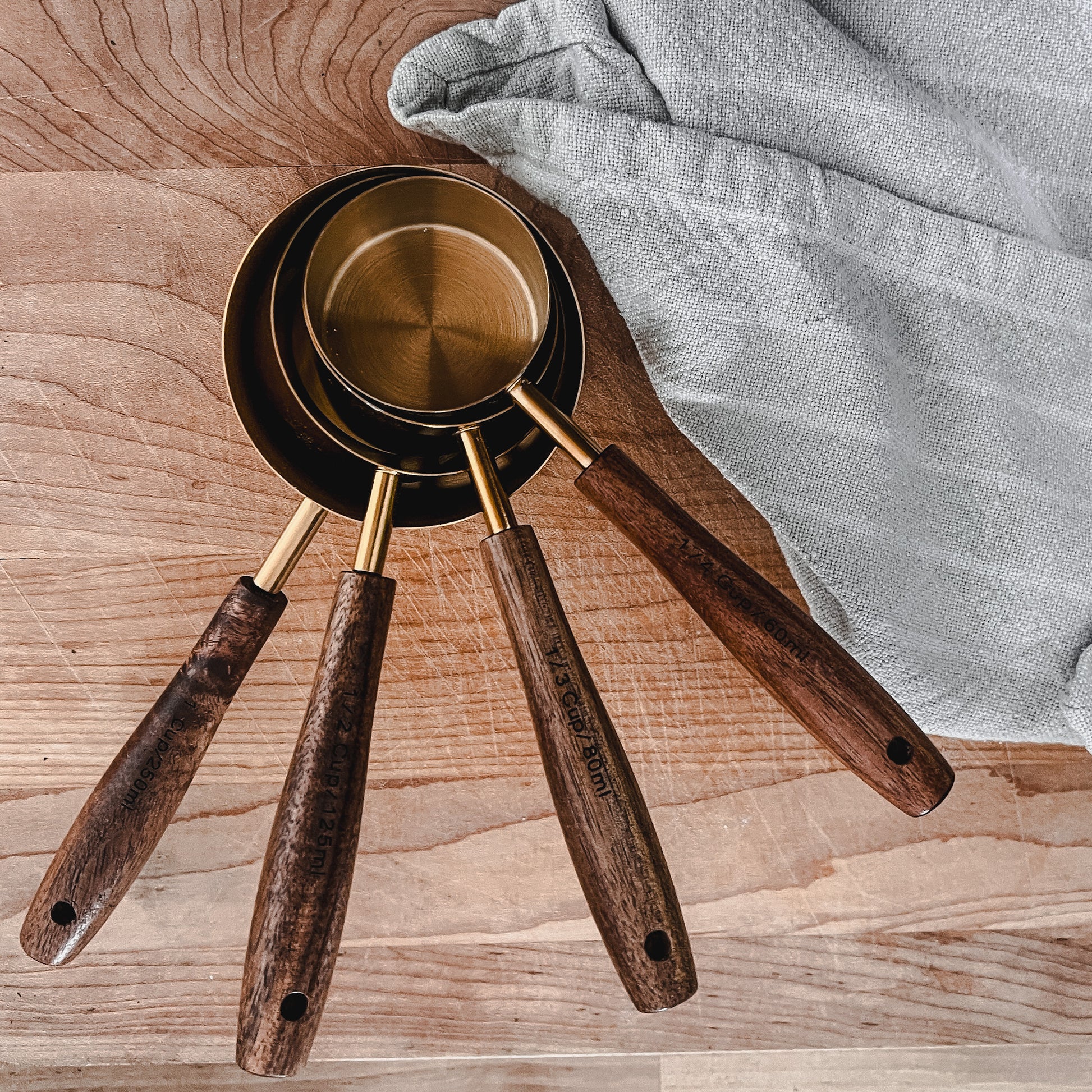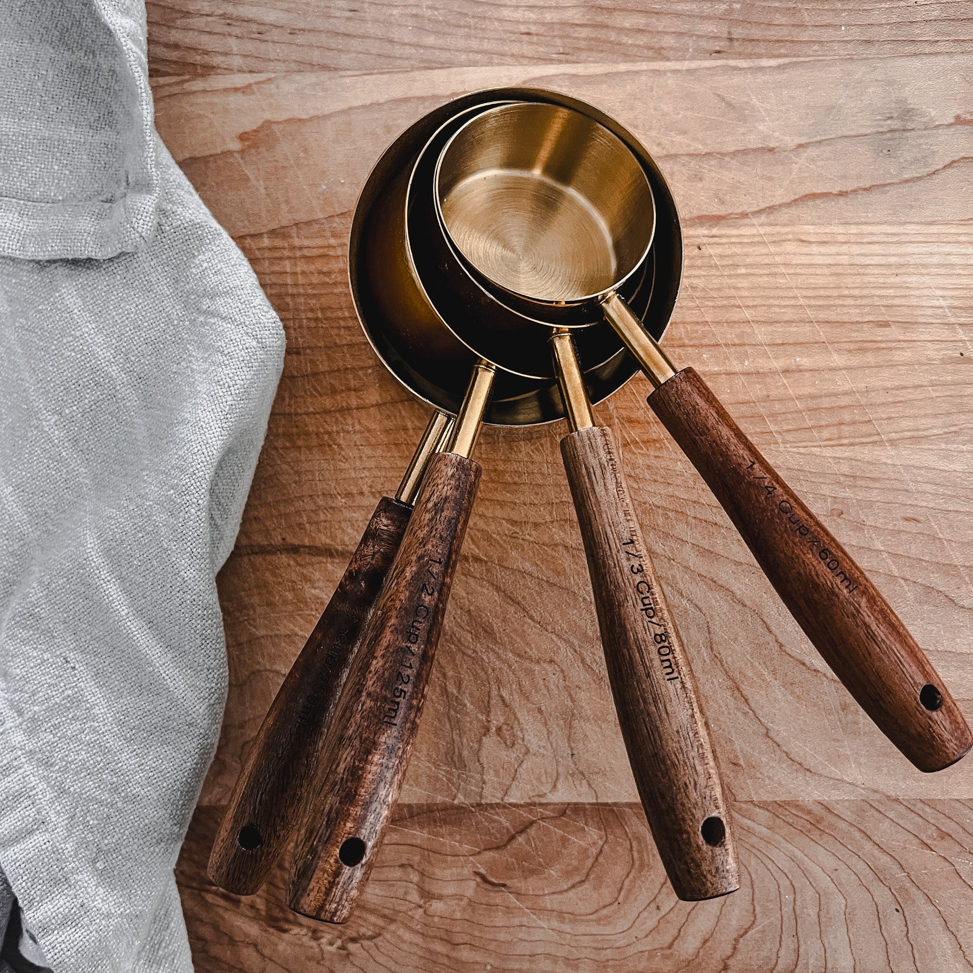 This sturdy set of gold tinted stainless steel measuring cups is perfect for any home cook seeking to elevate their kitchenware. Acacia wood handles and steel design are plastic free, durable and resistant to corrosion.