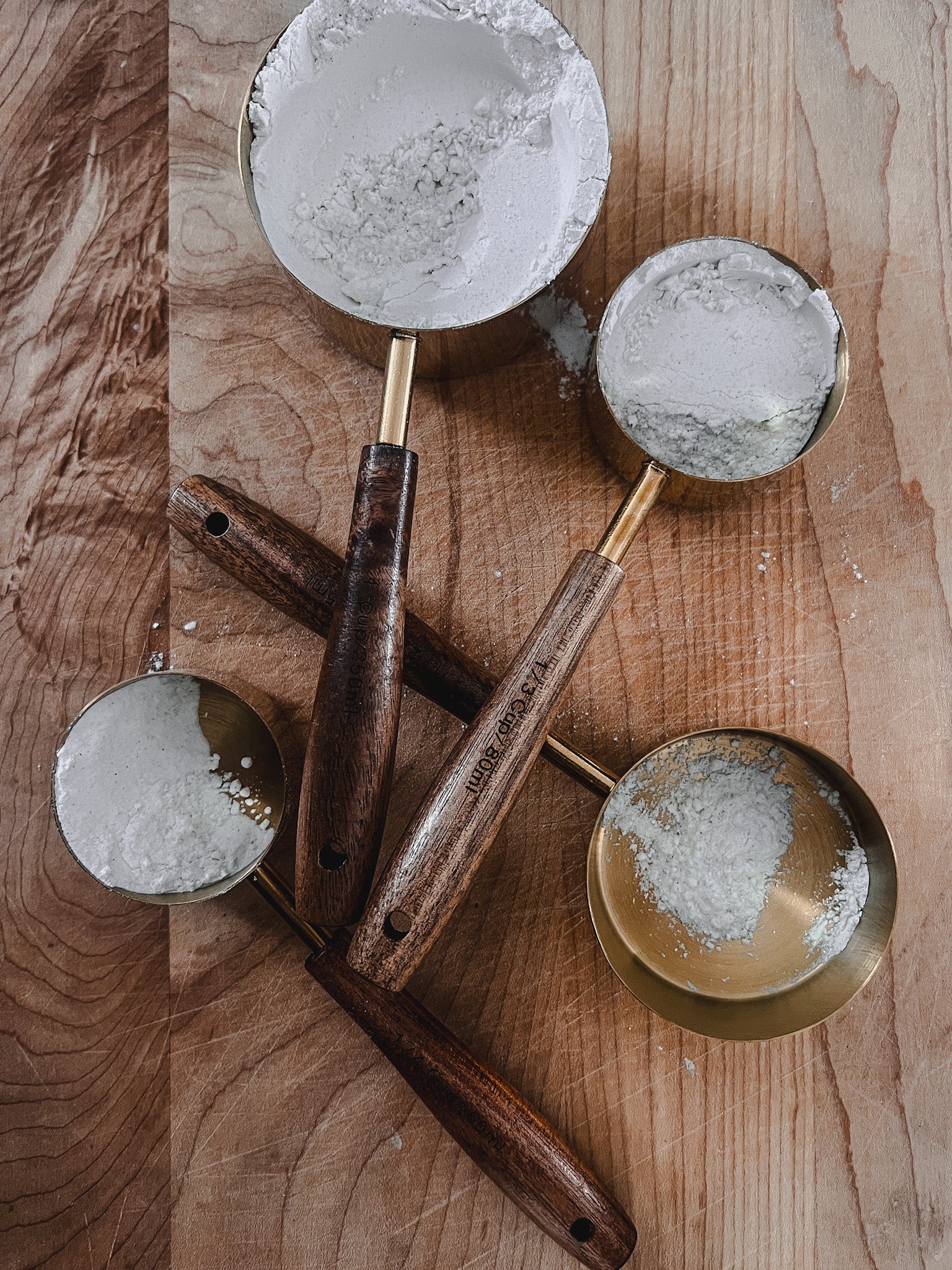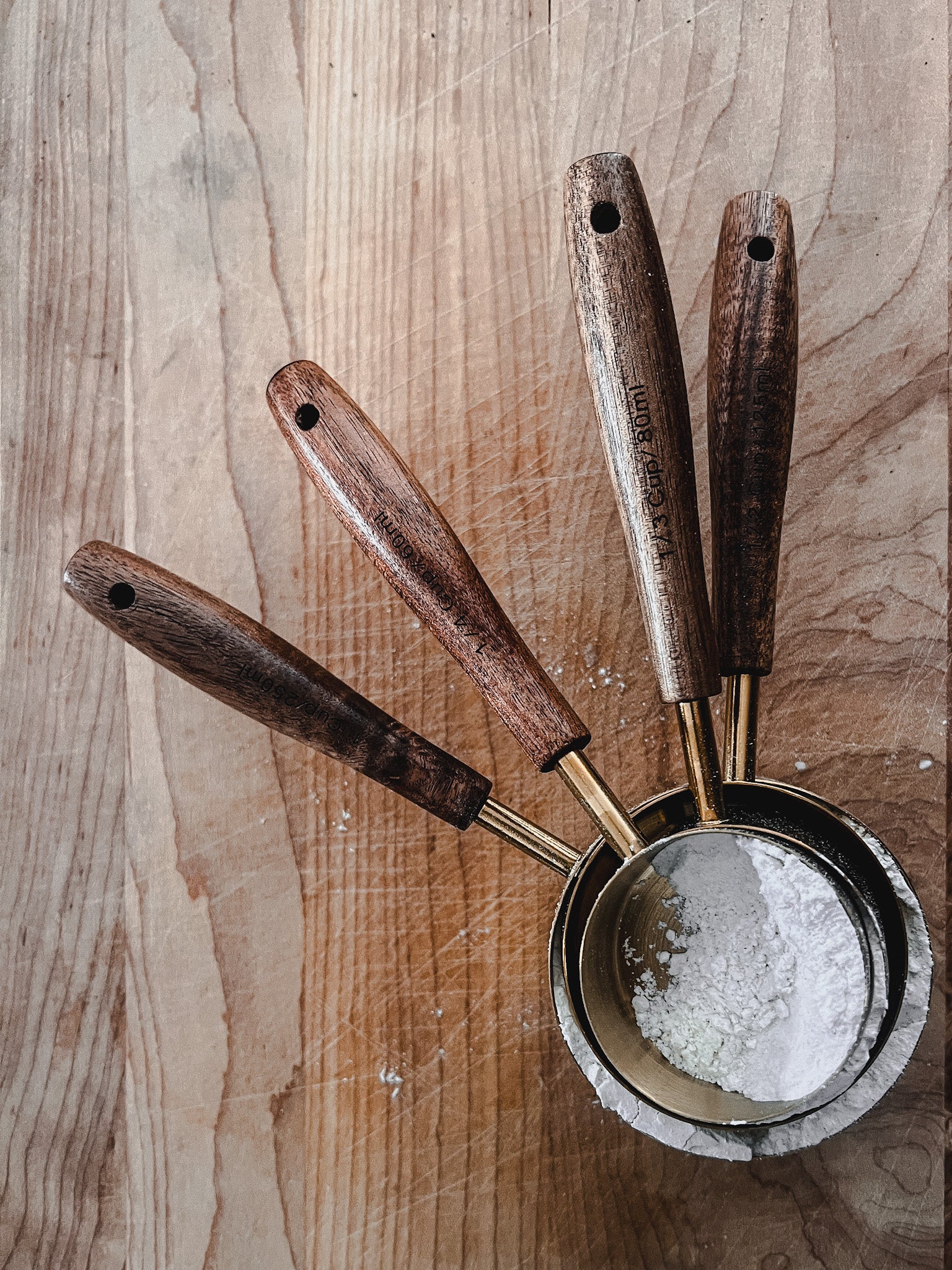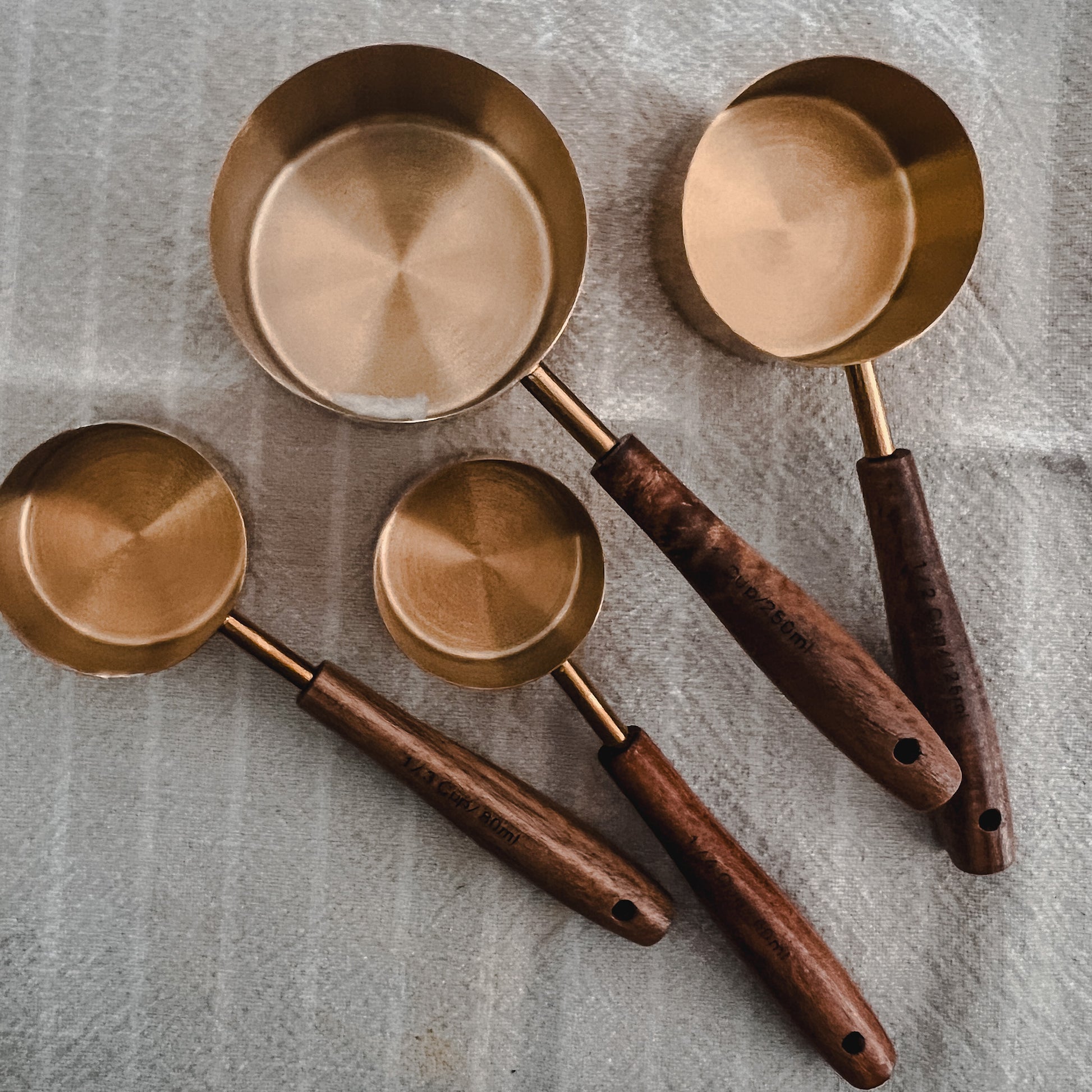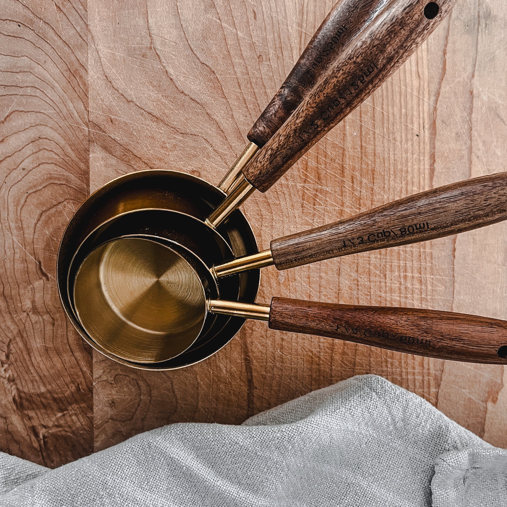 This sturdy set of gold tinted stainless steel measuring cups is perfect for any home cook seeking to elevate their kitchenware. Acacia wood handles and steel design are plastic free, durable and resistant to corrosion.