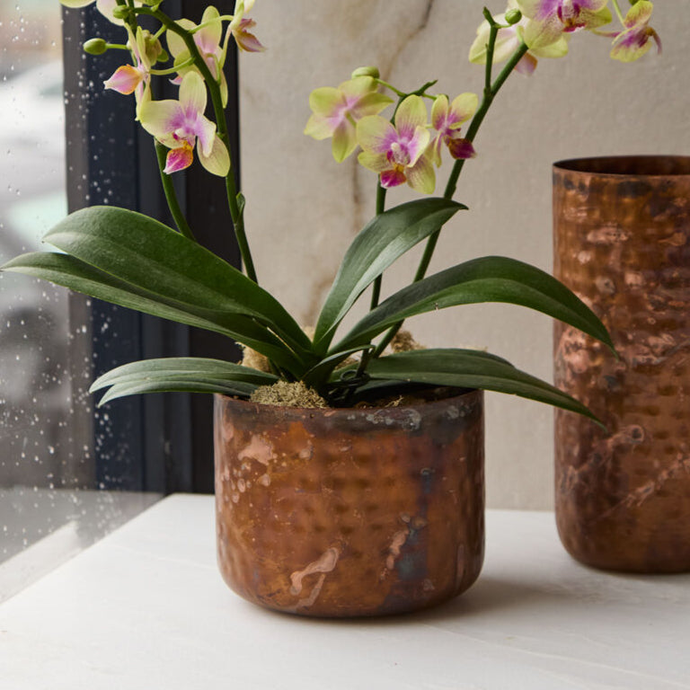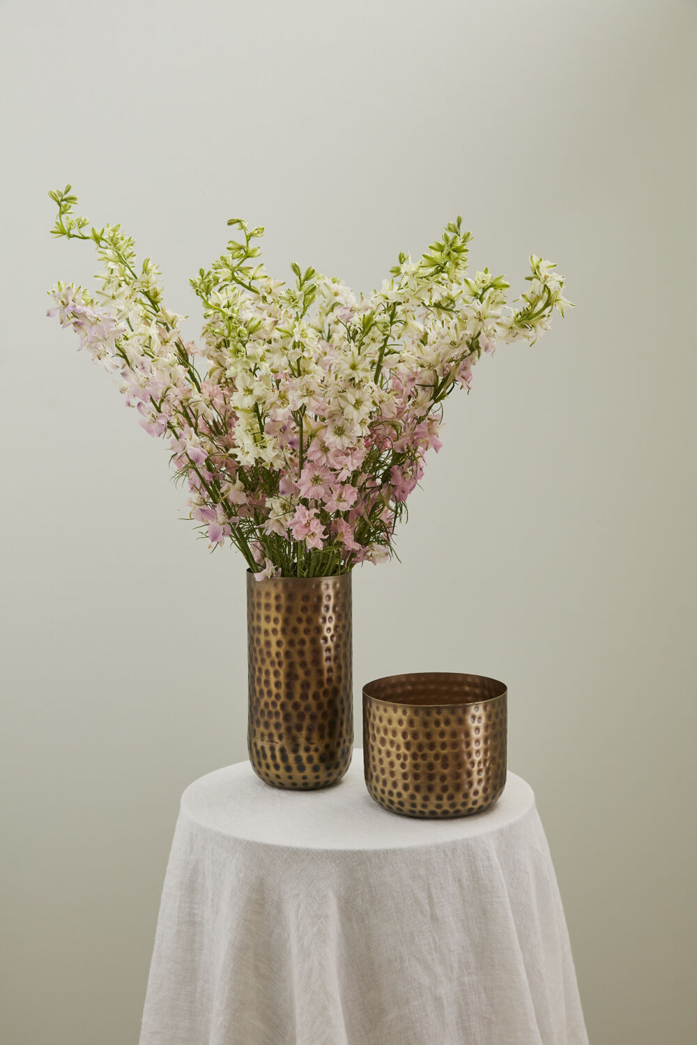 Bring old-world charm & a refined sensibility to floral design & weddings or events with the Alchemy Pot, perfect for a low arrangement or small plant. Featuring a simple silhouette, antiqued gold finish, & a dimpled design with subtle texture, this lightweight metal bowl elevates everyday decor & offers a sleek, understated look to formal events.