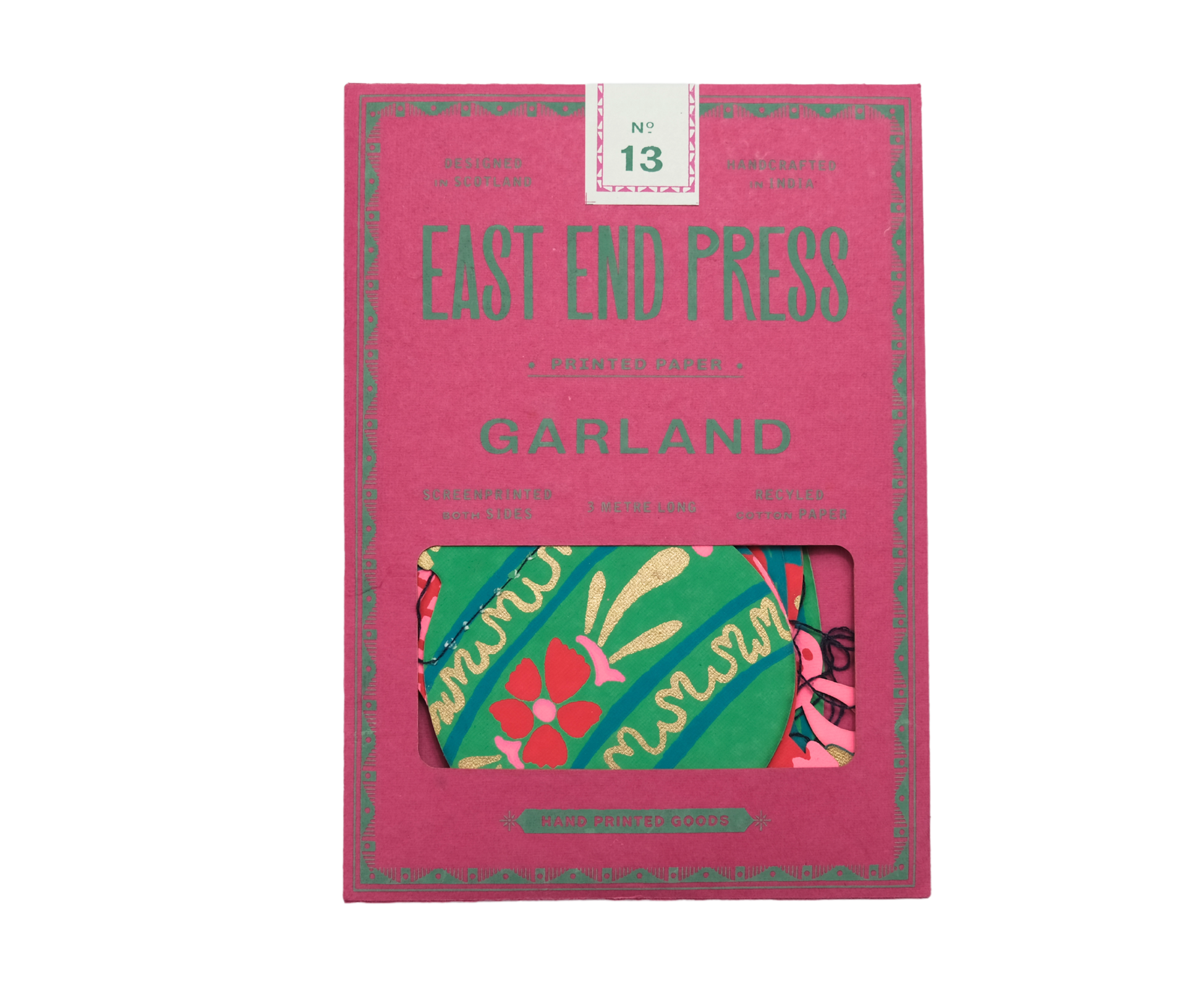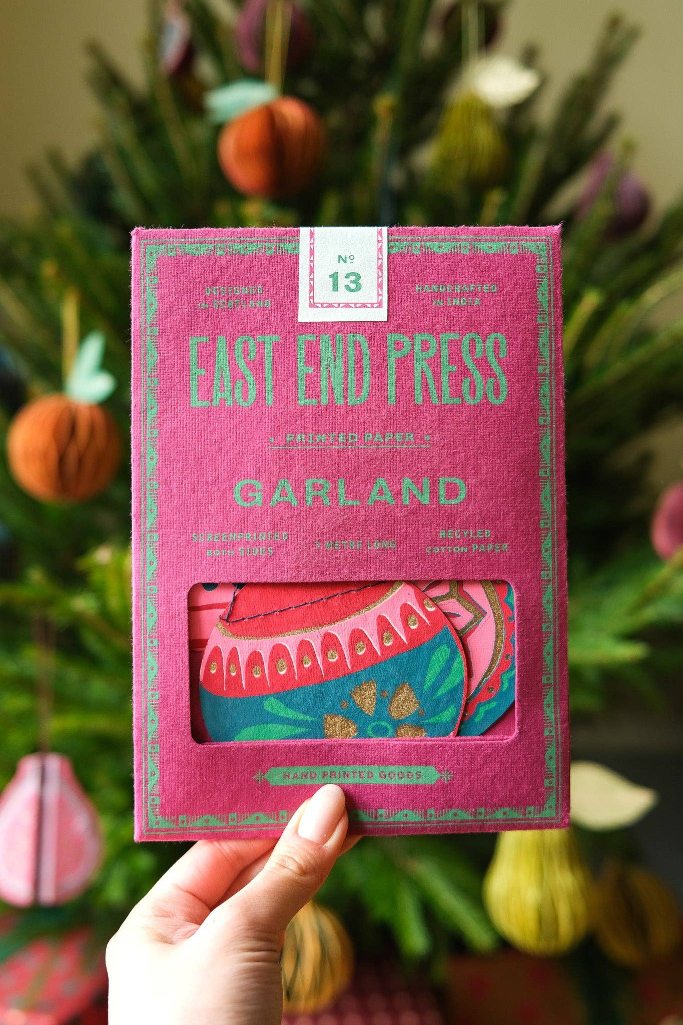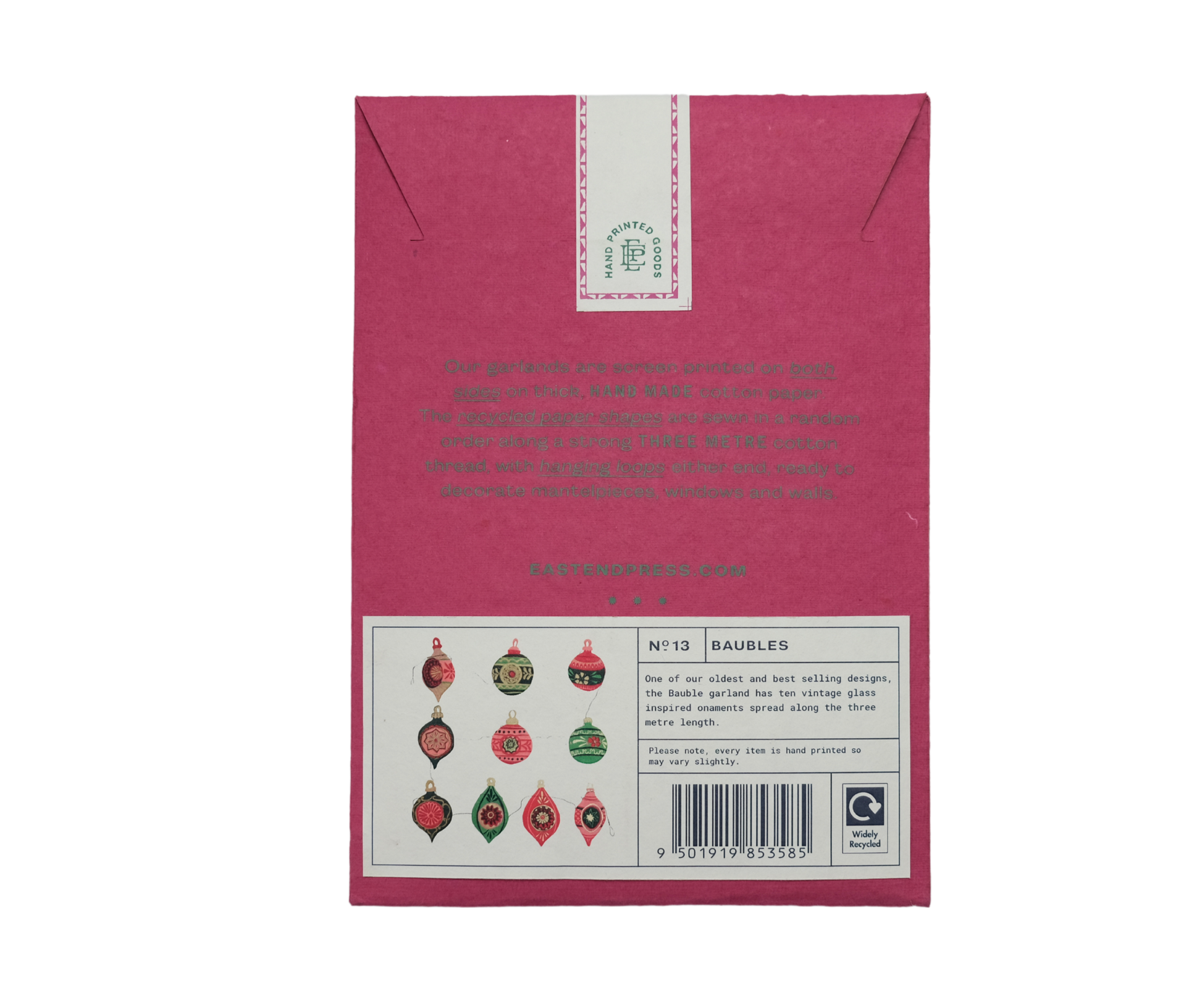 This bauble garland has ten vintage glass-inspired ornaments spread along the three-metre length. Screen printed by hand on both sides by talented artisans in Jaipur & sustainably made from recycled materials