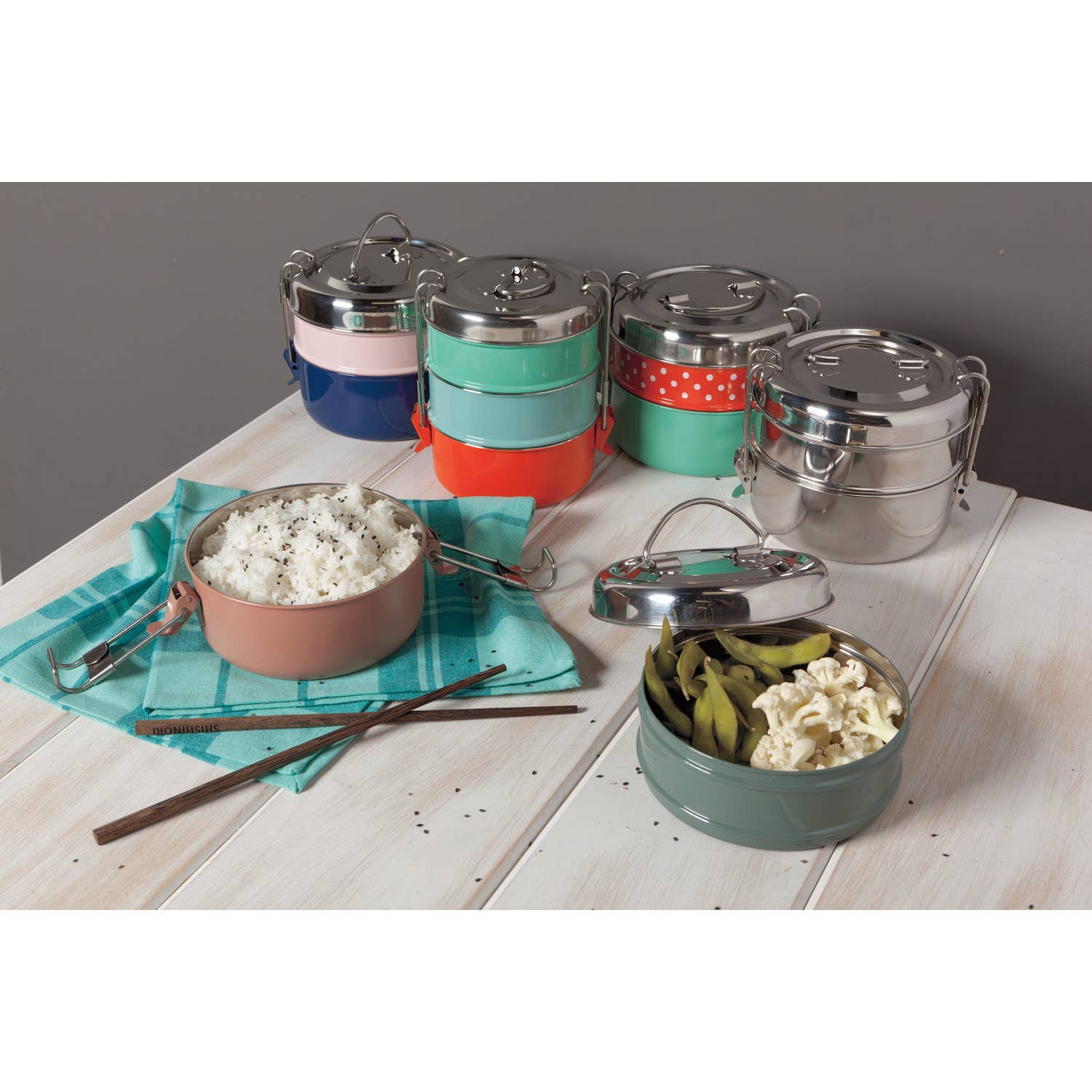 Originally used to pack up a homemade meal for transport through the busy streets of India, the tiffin is made up of stainless steel containers that stack together. A snap closure keeps contents secure while a handle makes carrying convenient.