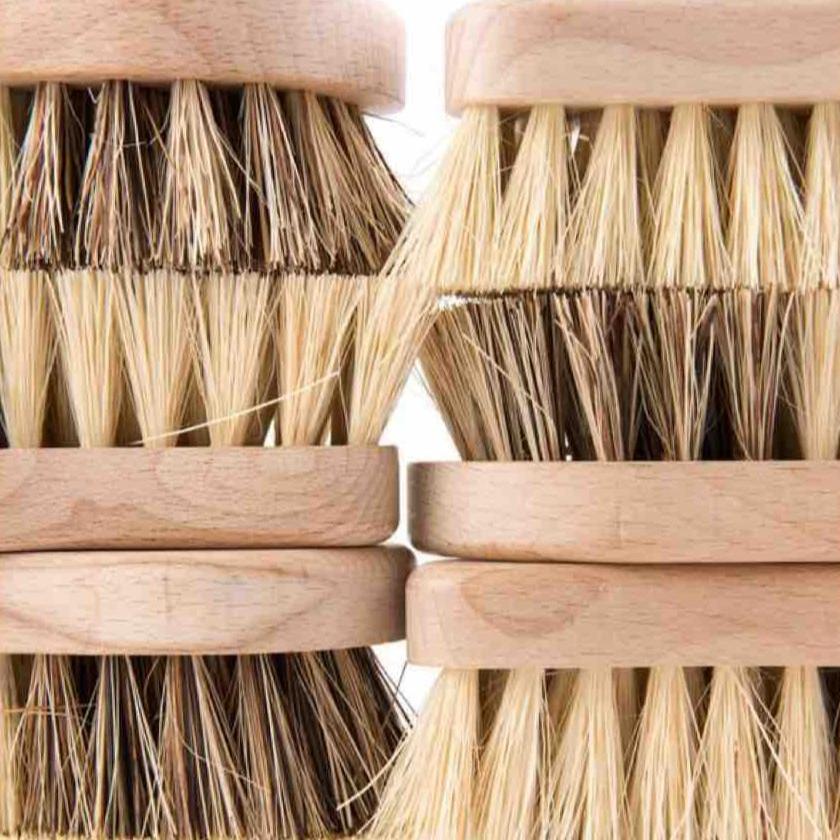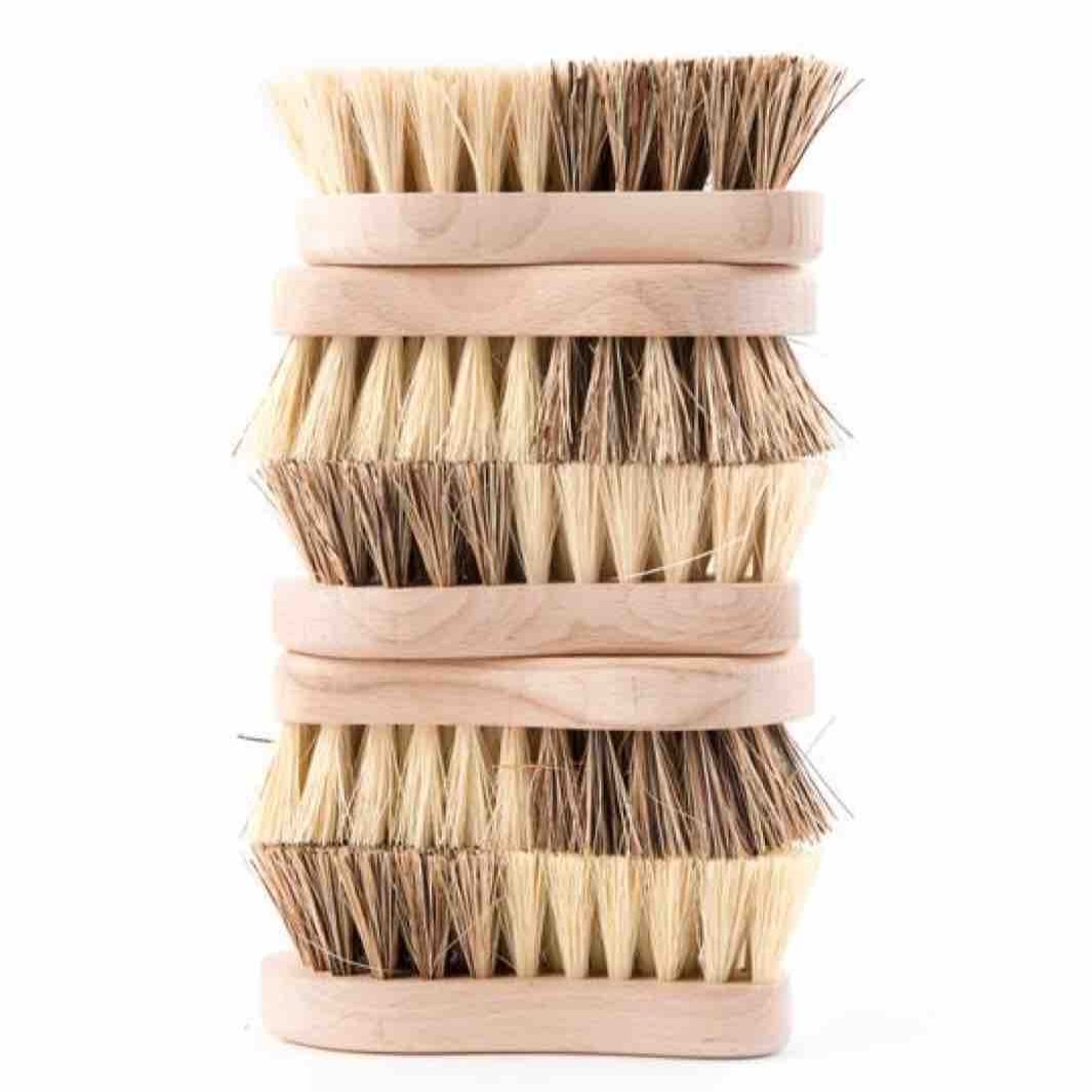 This vegetable brush has a rigid side made from bassine & tampico plant fibers, and a softer side of just tampico fibers. Bassine is coarse leaf fibers of the palmyra palm, while tampico comes from the leaves of agave & yucca plants.