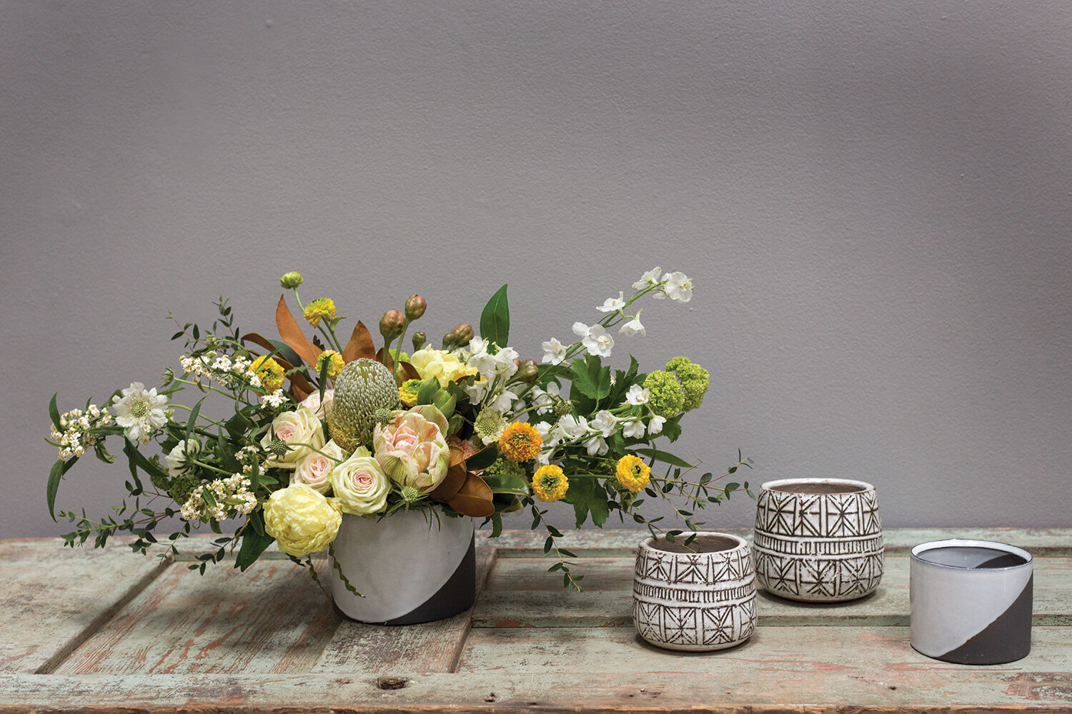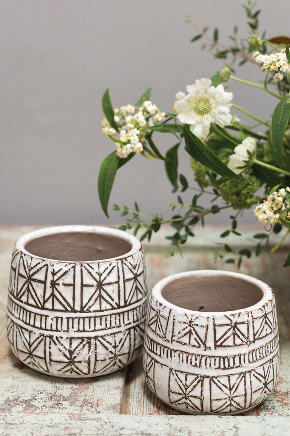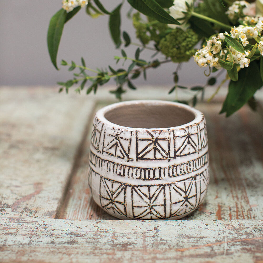 The substantial Naima Pot features a hand-stamped design that adds ethnic modern style. Featuring geometric patterns carved into a white glaze, this hefty holder can blend in with any decor.
