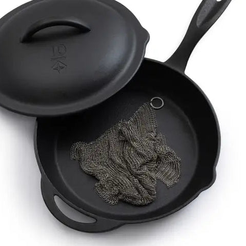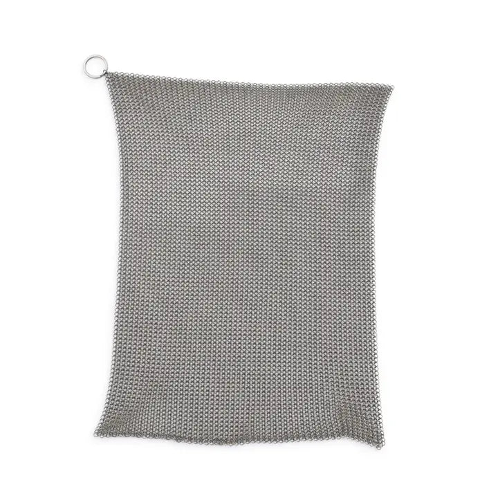 Stainless steel cleaning mesh for use with cast iron skillets and dutch ovens.
