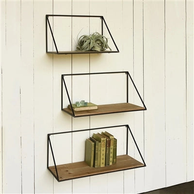 Crafted of iron and upcycled hull wood, these shelves have a minimalist style and a contemporary edge that draws the eye to photos, books and gathered objects.